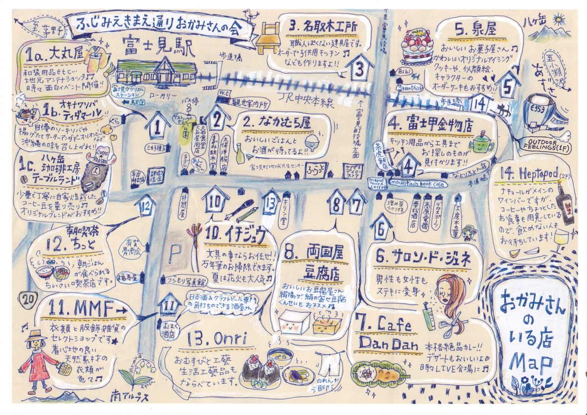 富士見駅周辺には様々なジャンルの飲食店があります。マップを参考に気分に合わせたランチをお楽しみください。また、飲食以外にも様々なお店がありますので、ぜひまちあるきをお楽しみ下さい。